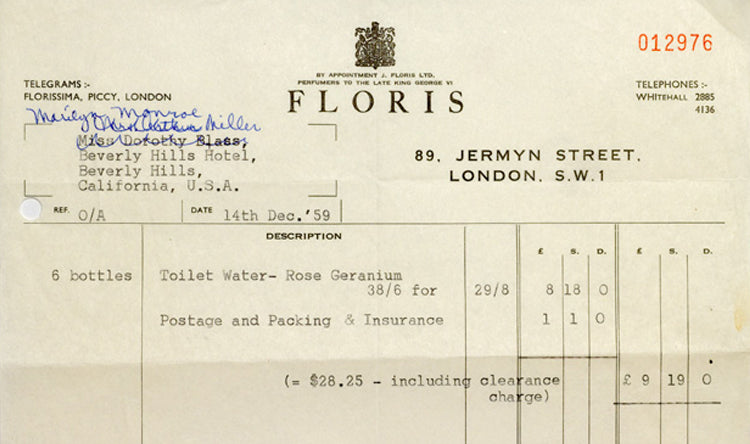 Rose Geranium was first introduced by Floris in 1890 when pink geranium was added to the existing Geranium fragrance. We are incredibly fortunate to have a receipt in our museum at 89 Jermyn Street dated December 1959, showing a purchase of 6 bottles of Rose Geranium made for Marilyn Monroe Miller while she stayed at Beverly Hills Hotel, California.